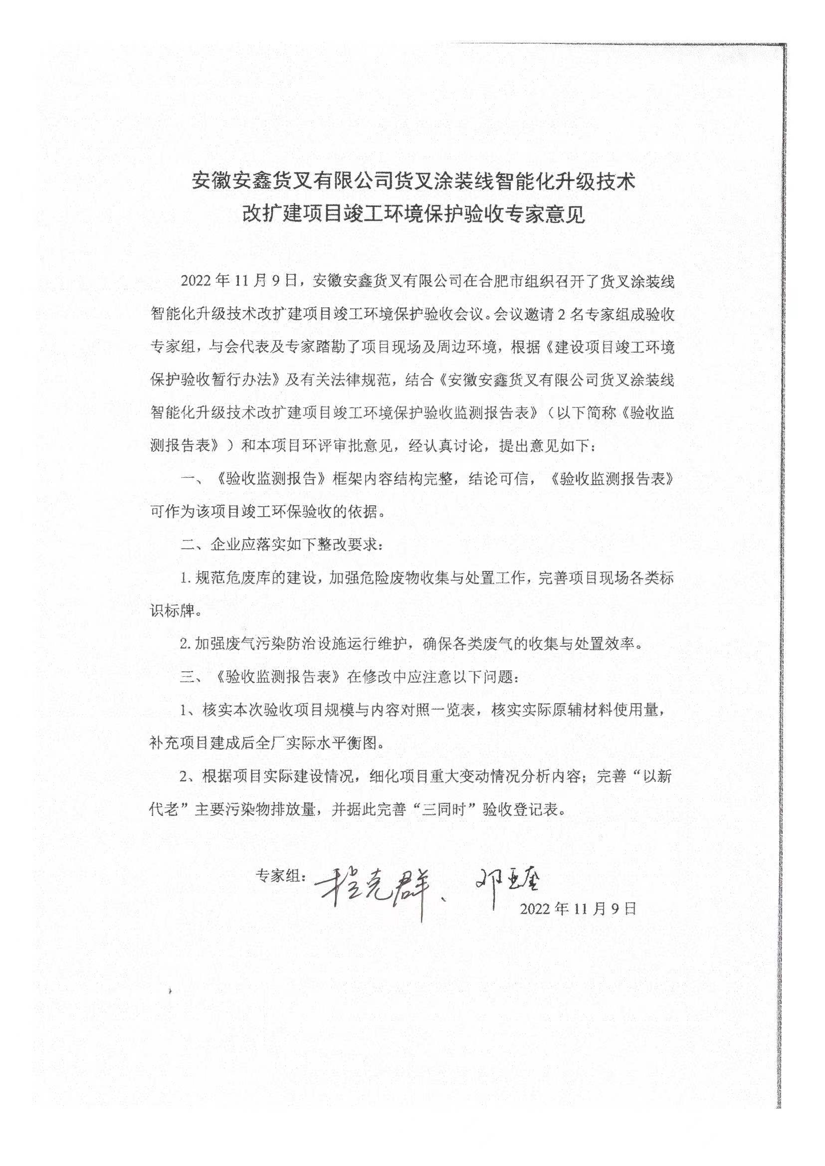 1、安徽安鑫貨叉有限公司貨叉涂裝線智能化升級技術改擴建項目竣工環(huán)境保護驗收調查報告及驗收意見