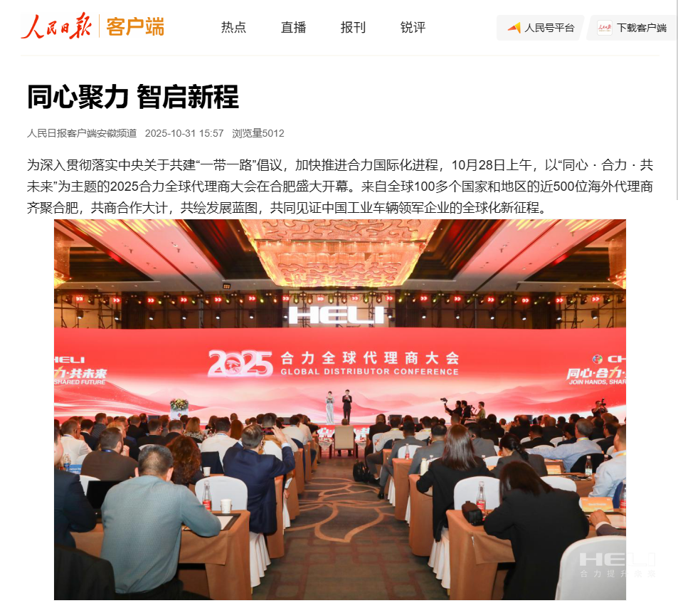 10月28日至31日,“同心?合力?共未來”2025合力全球代理商大會(huì)在合肥召開,引發(fā)媒體廣泛關(guān)注,新華社安徽分社、中央廣播電視臺(tái)安徽總站、經(jīng)濟(jì)日報(bào)、證券日報(bào)、央廣網(wǎng)、中國工業(yè)報(bào)、人民網(wǎng)安徽頻道、新華網(wǎng)安徽頻道、安徽日報(bào)、安徽新聞聯(lián)播等28家媒體、46名記...
