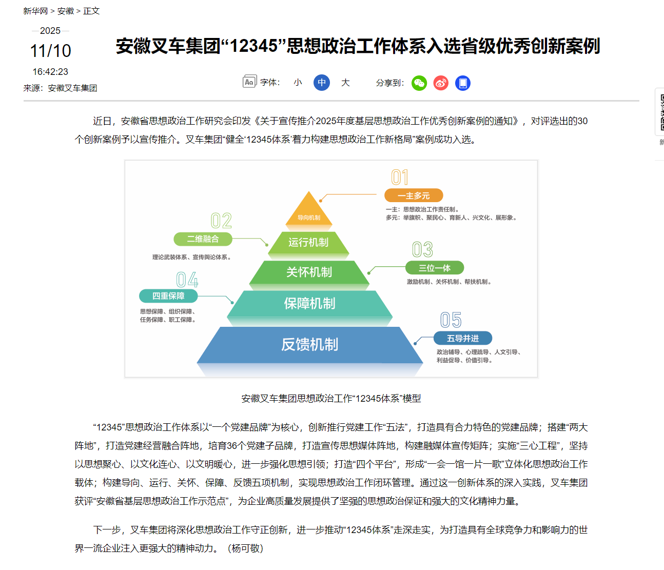 【新華網(wǎng)】安徽叉車集團(tuán)“12345”思想政治工作體系入選省級(jí)優(yōu)秀創(chuàng)新案例